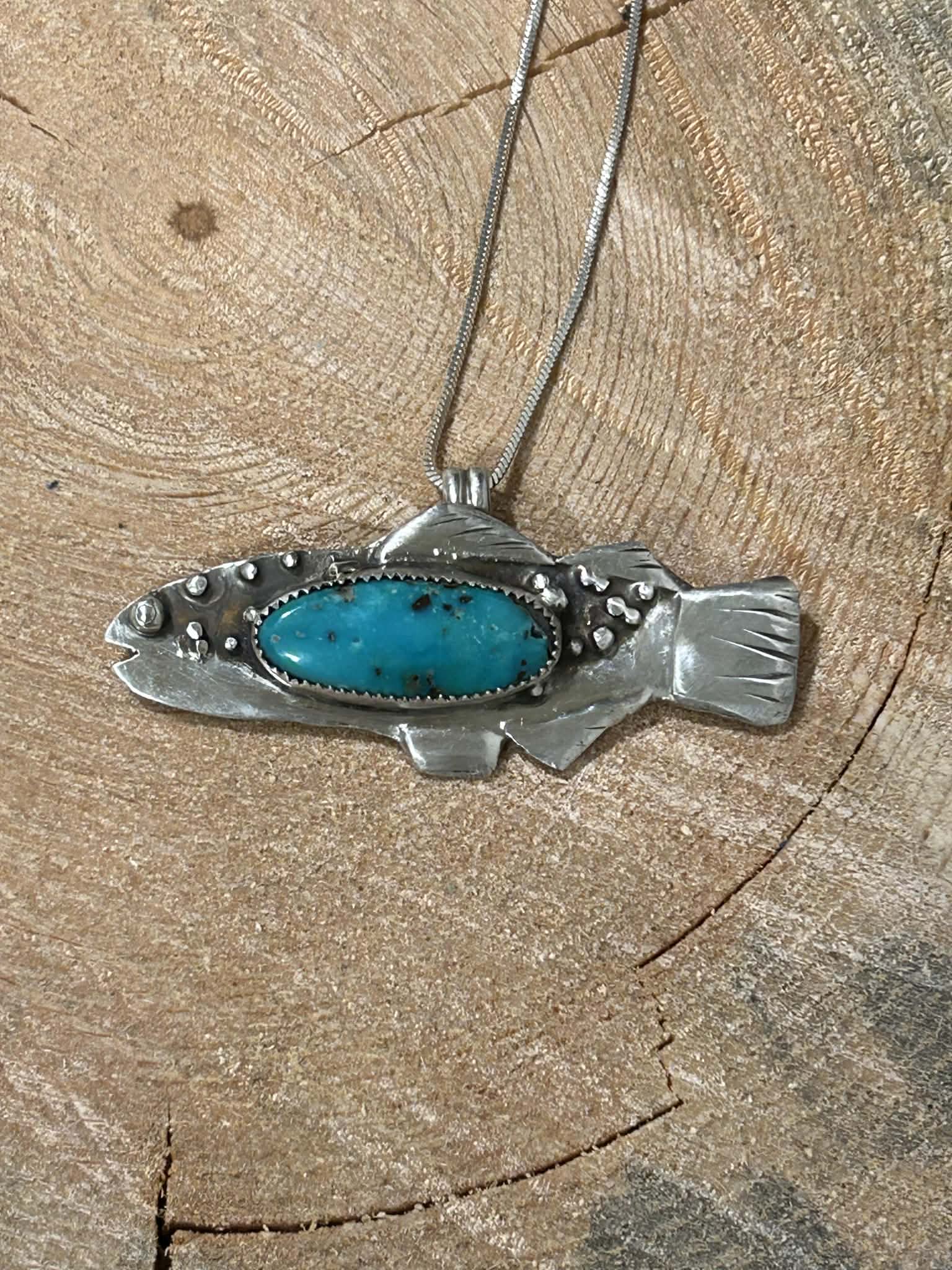 Hand-fabricated sterling silver fish with emerald valley turquoise. One of a kind!